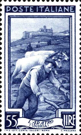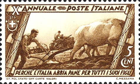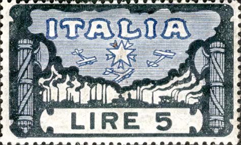 –         La panoramica su un paesaggio industriale. Il tema è assai raro nel repertorio fascista italiano (completamente ignorato da quello nazista) in quanto entrambi ideologicamente prediligevano propagandare i valori agresti dei due popoli, mentre lo ritroviamo in molti dei più antichi francobolli sovietici.