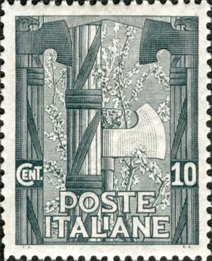 Nel 1923 Giacomo BALLA (1871 – 1958), per il primo anniversario della Marcia su Roma, crea due (uno è ripetuto) dei francobolli più belli della storia postale italiana, forte dell’esperienza di grafico pubblicitario e progettista teatrale.