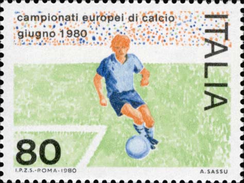 Aligi SASSU (1912 – 2000) nel 1980 in occasione dei campionati europei di calcio, disegna il bozzetto che si fa notare per l’eleganza, la sobrietà e la dinamicità.
