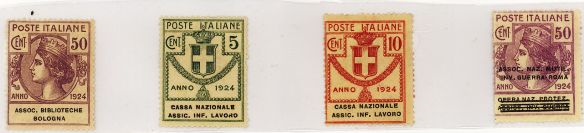 Nel 1924 furono adottati in Italia speciali francobolli ( fino a 8 per ciascun Ente ), con vignette differenti ( tre in tutto ) a seconda del valore facciale, ufficialmente per facilitare la contabilità degli Enti parastatali; molto probabilmente perchè fidarsi è bene e non fidarsi è meglio in qualunque tempo e regime. Sono piuttosto belli; si tratta in tutto di 63 francobolli, alcuni aaccessibili ed altri molto rari, specialmente, come sempre, se sulle buste originali degli Enti regolarmente viaggiate.
