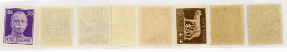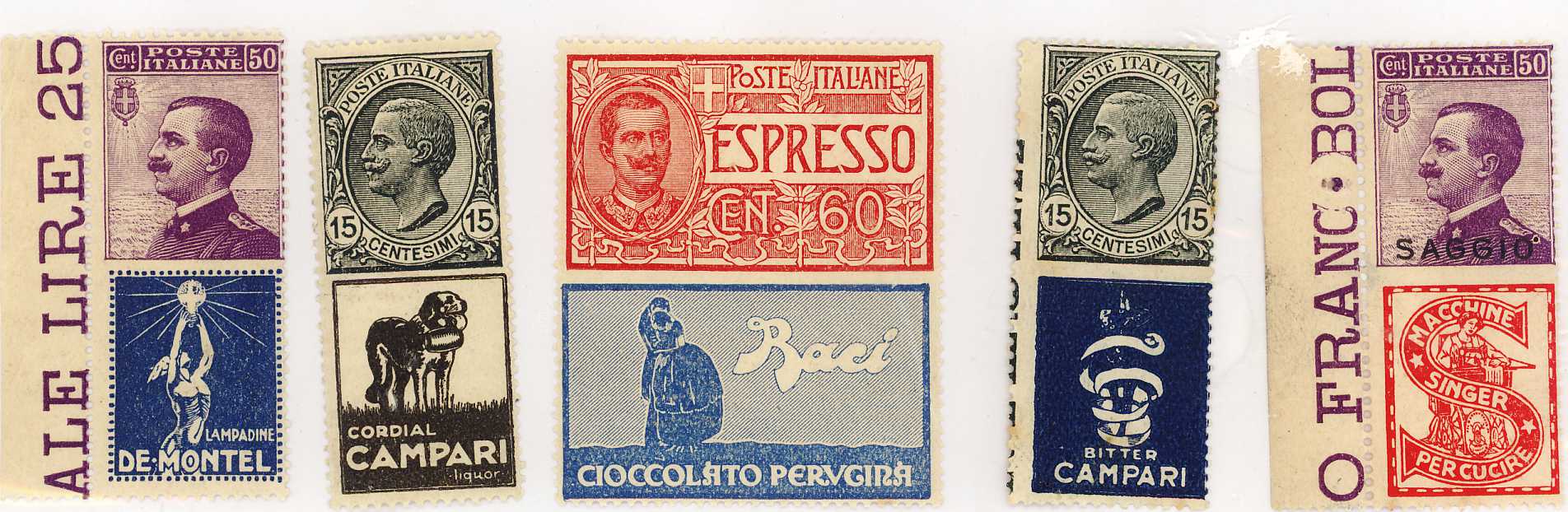 Un caso bellissimo e, per quanto ne so io, realizzato solo in Italia negli anni 1924/1925, è quello dei francobolli pubblicitari, cioè recanti accanto alla vignetta normale una appendice pubblicitaria, senza dentellatura di separazione, al posto della verticale successiva. Sono tutti molto belli: se ne trovano di abbastanza comuni e di molto rari. Esistono anche con la sovrastampa ” Saggio “, ovviamente non usati.