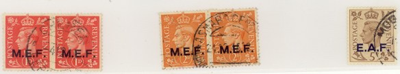 Gli Anglo – Americani nei territori da loro occupati si comportano invece in maniera diversa. Per le Colonie italiane furono usati i francobolli di Re Giorgio con la sovrastampa M.E.F. (Middle East Forces – Forze del Medio Oriente) oppure E.A.F. (Forze dell’Africa Orientale), lasciando intendere che si trattava di una occupazione e non di una annessione o conquista.