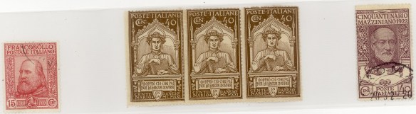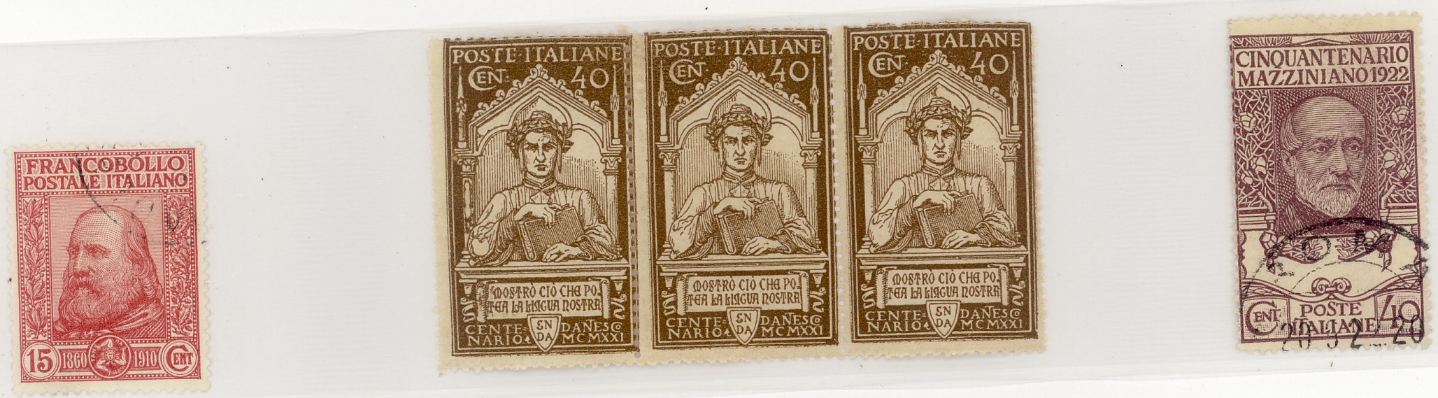 Per vedere qualcosa di diverso bisogna arrivare al 1910 quando sui francobolli italiani appare Garibaldi; Dante nel 1921 e Mazzini nel 1922.
