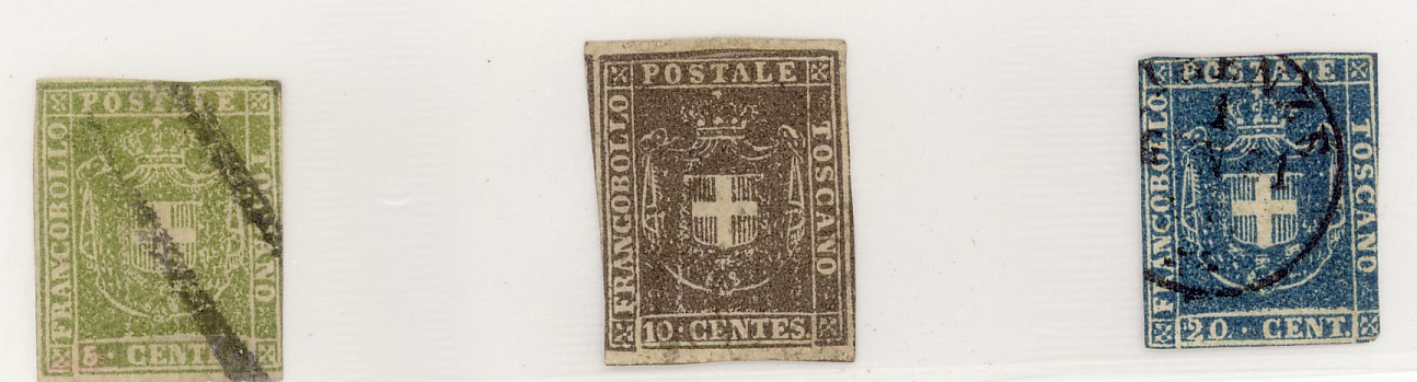 Per l’ex Granducato di Toscana il Governo Provvisorio emette l’8 Luglio 1859 un francobollo da 9 crazie ancora con il leone ( marzocco ), ma il 1° Gennaio 1860 appaiono 7 francobolli con lo stemma della Casa Savoia e valori in centesimi, che avranno corso fino al 31 Dicembre 1861 quando saranno sostituiti da quelli dal Regno d’Italia.