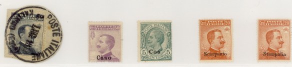 A quelli della mia generazione a scuola non è stato detto che tra il 1911 ed il 1912 si svolse la ” guerra italo – turca “, quando,  praticamente senza resistenza, truppe italiane occuparono le isole dell’Egeo, la costa somala in profondità e la Libia. Le popolazioni locali non parteggiarono quasi mai per uno dei contendenti, con qualche preferenza per gli italiani. Per le isole dell’Egeo furono dapprima inviati dei timbri di gomma usati su francobolli nazionali, poi francobolli con sovrastampa per ciascuna isola.