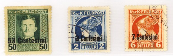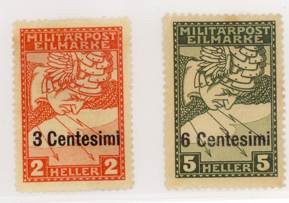 Il 24 Ottobre 1917 le truppe austro – ungariche sfondano le linee italiane a Caporetto e dilagano fino al Piave dove sono fermate da una nuova linea difensiva. Il 1° Giugno 1918 nei territori occupati appaiono francobolli austriaci – Posta da Campo – con sovrastampe in centesimi e lire.
