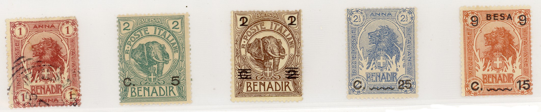 Per la costa della Somalia sul Mar Rosso, occupata a partire dal 1903 ed inizialmente indicata come ” Benadir “, erano stati approntati dei bellissimi francobolli originali, che dal 1906 al 1926 vengono sovrastampati più volte con valori quando in lire, quando nella moneta locale ( anna e rupie ).