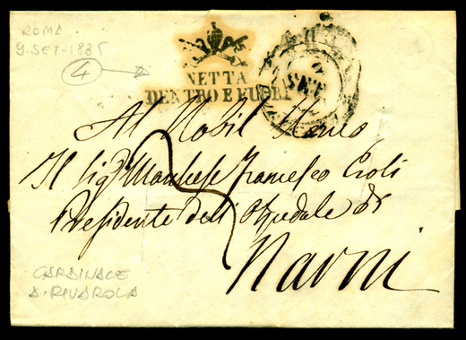 Questa lettera, con lo stemma pontificio e la scritta NETTA DENTRO E FUORI e con i tagli che la trapassano da parte a parte, è il primo incontro con l’argomento “colera” nello Stato Pontificio. Una lettera tra personaggi importanti, inviata dal Cardinale A. Rivarola al Marchese Francesco Eroli.