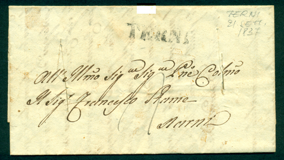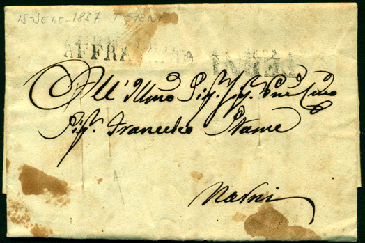 La prima è del 15 settembre 1837, inviata con porto pagato dal mittente, e reca sul fronte il timbro AFFRANCATA di Terni oltre al TERNI stampatello (impresso a rovescio) e i 4 classici tagli passanti. Le macchie sulla soprascritta sono dovute alla disinfezione eseguita per fumigazione che era agevolata nella penetrazione interna dai tagli . Questa operazione veniva eseguita disponendo le lettere su una grata di metallo posta sopra ad un recipiente che conteneva il liquido in ebollizione. I vapori toccavano soprattutto la superficie esterna ma penetravano anche all’interno grazie alle manovre fatte con apposite pinze.