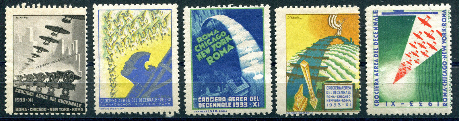 La Crociera aerea del Decennale o Crociera Nord Atlantica fu la seconda ed ultima crociera aerea transatlantica di massa che si tenne tra il 1º luglio ed il 12 agosto 1933,venne organizzata da Italo Balbo nel primo decennale della Regia Aeronautica e come occasione di propaganda per l’Esposizione Universale che si tenne a Chicago e per il centenario della città.Vi presero parte 25 idrovolanti SIAI-Marchetti S.55X, organizzate in 8 squadriglie. A bordo 52 ufficiali piloti,1 ufficiale ingegnere e 62 sottufficiali specialisti,ritornarono in Italia in 24 velivoli.Anche per questo evento oltre alle cartoline ufficiali,furono emessi dei trittici di francobolli con sovrastampata la matricola del velivolo ed una serie di 5 erinnofili i cui proventi furono devoluti completamente agli Orfani degli Aviatori: