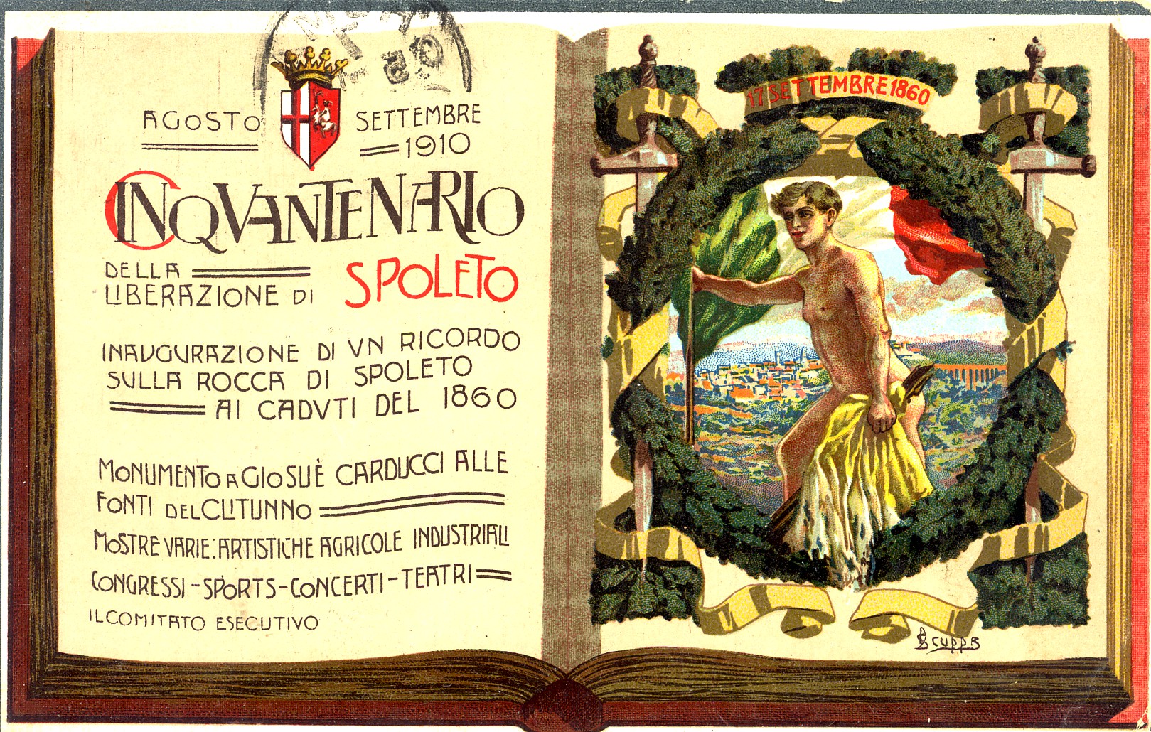 Cartolina commemorativa del cinquantenario della liberazione di Spoleto spedita da Spoleto a Roma il 6 maggio 1910.