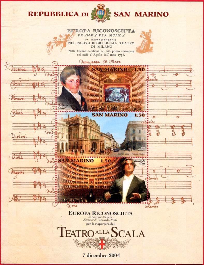 San Marino: Foglietto dedicato alla riapertura nel 2004 del Teatro alla Scala con ” Europa riconosciuta “, diretta da Riccardo Muti;opera lirica in due atti musicata da Antonio Salieri e rappresentata per la prima volta il 3 Agosto 1778 per l’inaugurazione del Teatro stesso. Disegnatore: F. Filanci.